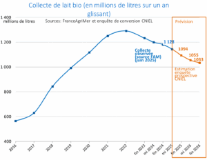 Par conséquent, l’offre de lait bio devrait continuer de reculer fortement dans les prochains mois. A août 2025, la collecte était en baisse de 5% sur un an glissant, à 1,13 milliard de litres, un niveau 13% inférieur à celui du record atteint début 2023. Au regard des cessations prévues, notre enquête prospective prévoit que la production laitière pourrait s’approcher de la barre du milliard de litre d’ici fin 2026.