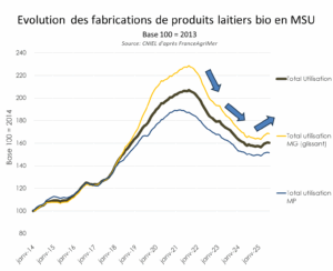 En parallèle, la demande de lait bio repart légèrement à la hausse. Résultat : les fabrications de produits laitiers bio progressent de 3 % sur le début de l’année 2025 — c’est la première hausse depuis quatre ans !