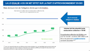 En 2025, la demande de produits laitiers bio continue de reculer légèrement dans les grandes surfaces. En revanche, elle progresse nettement dans les circuits spécialisés bio, mais aussi en restauration collective, où la part du bio dépasse désormais 10 % des achats de produits laitiers en valeur, portée par la mise en œuvre progressive de la loi EGAlim.*** si la loi était pleinement appliquée, et le seuil de 20% de bio atteint par tous les acheteurs, cela pourrait représenter un potentiel de 100 millions de litres de lait bio supplémentaires absorbés dans les prochaines années.