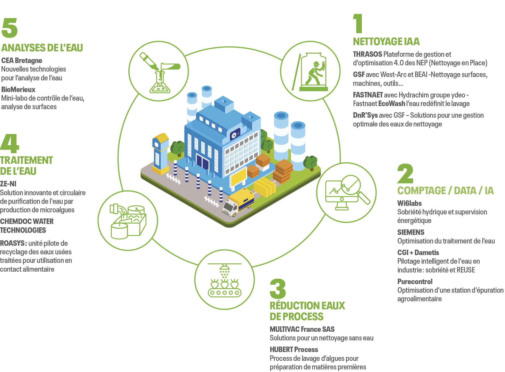 1) Nettoyage IAA avec 4 démonstrateurs : Plateforme de gestion et d’optimisation 4.0 des Nettoyage en place (NEP) par Thrasos (Saint-Malo, 35) / Installation « eau connectée », pour une gestion optimisée de l’eau de nettoyage par GSF (Rennes, 35) avec West-Arc (Mellac, 29) et Bretagne Electricité Automatisme Industriel (Mellac, 29) / Solution Fastnaet EcoWash, l’eau redéfinit le lavage par Fastnaet avec Hydrachim (groupe ydeo) (Moëlan-sur-Mer, 29) / Solutions pour une gestion individualisée des eaux de nettoyage développées par KEMTAG (Québriac, 35) avec GSF et Fastnaet.